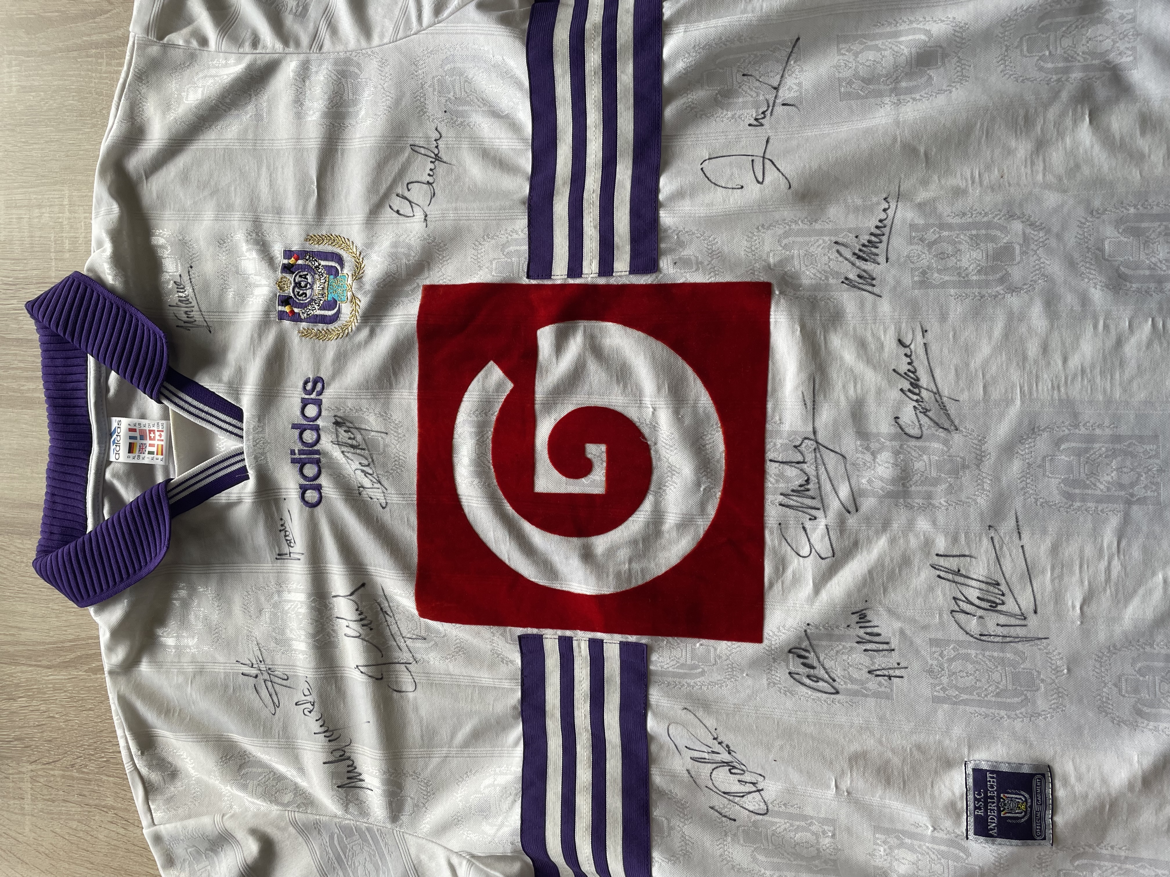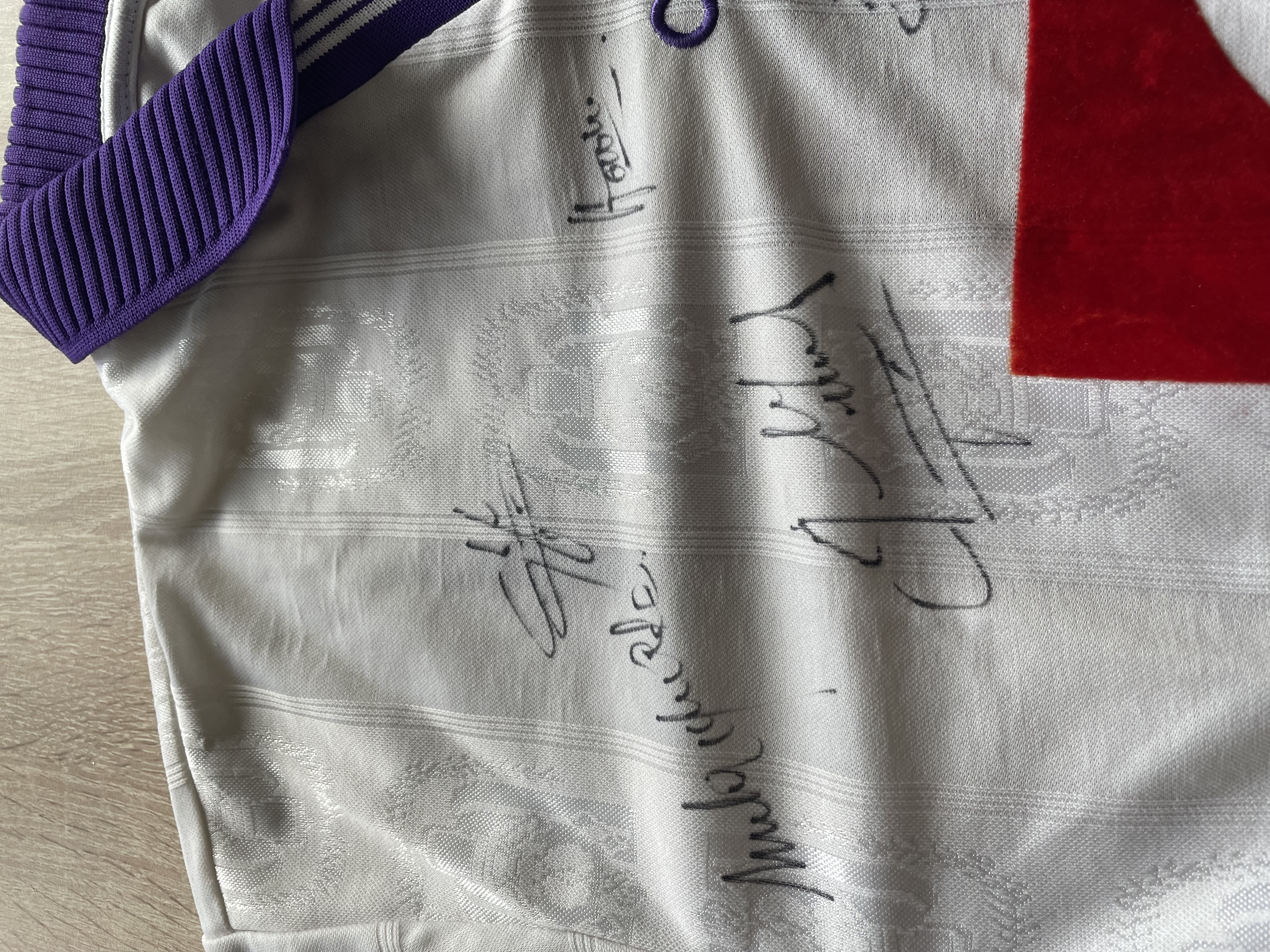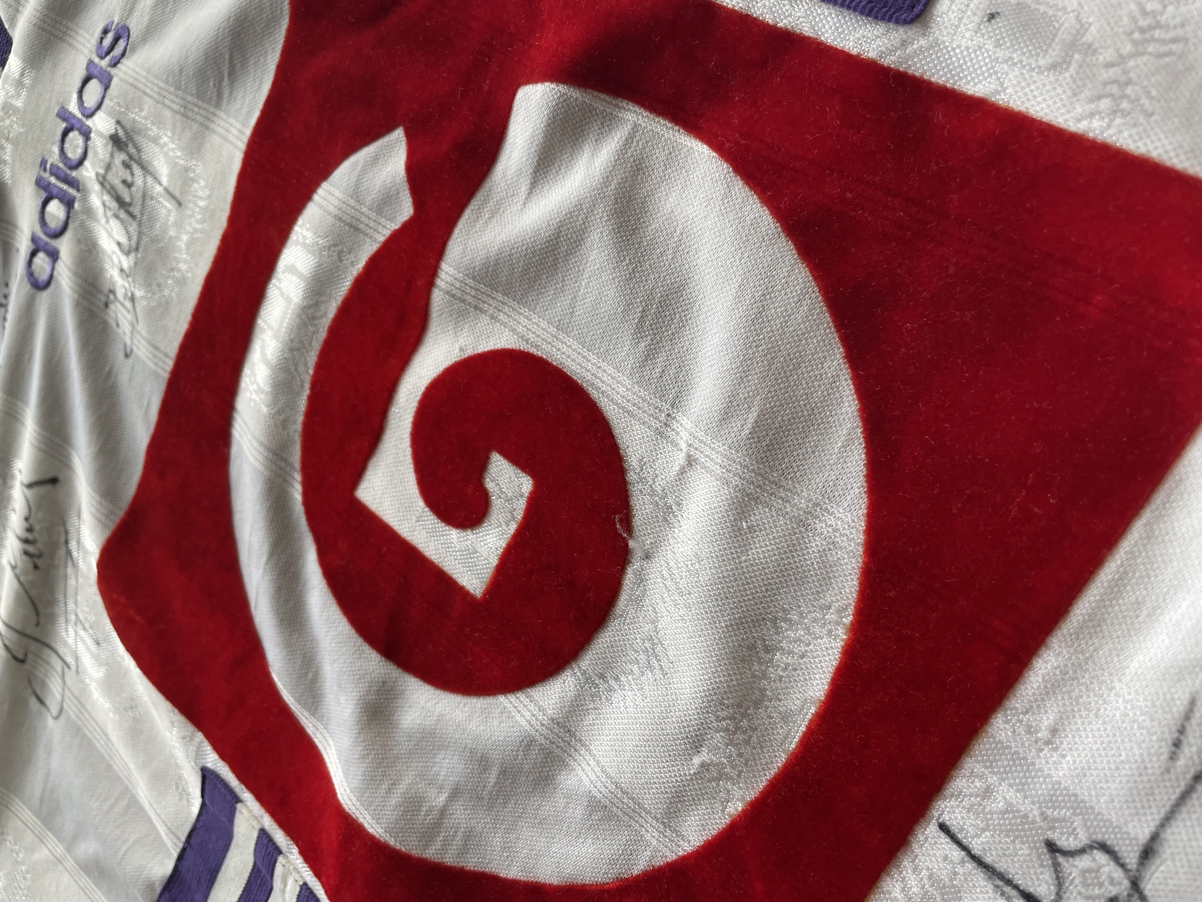The shirt is signed by the whole squad.