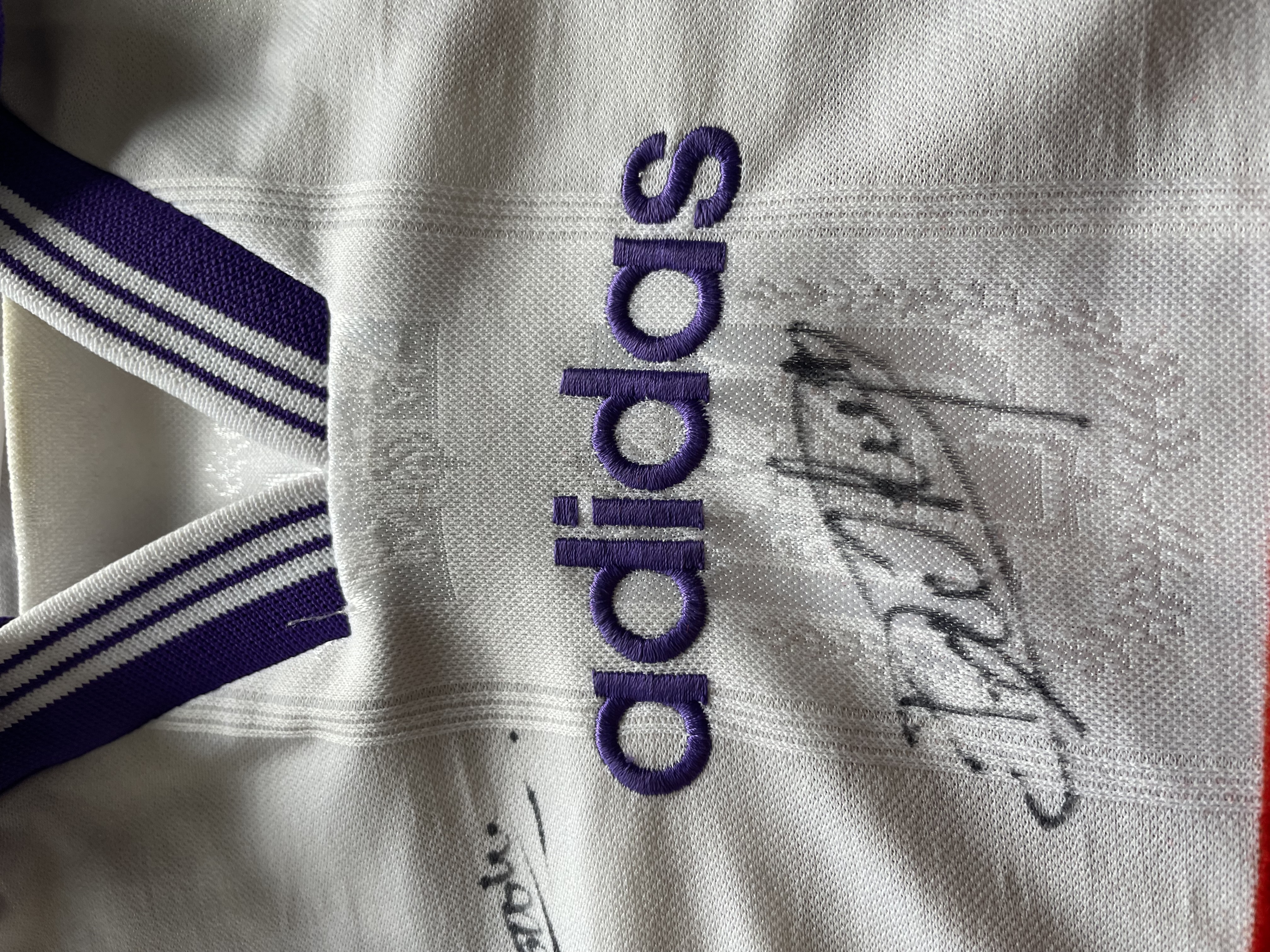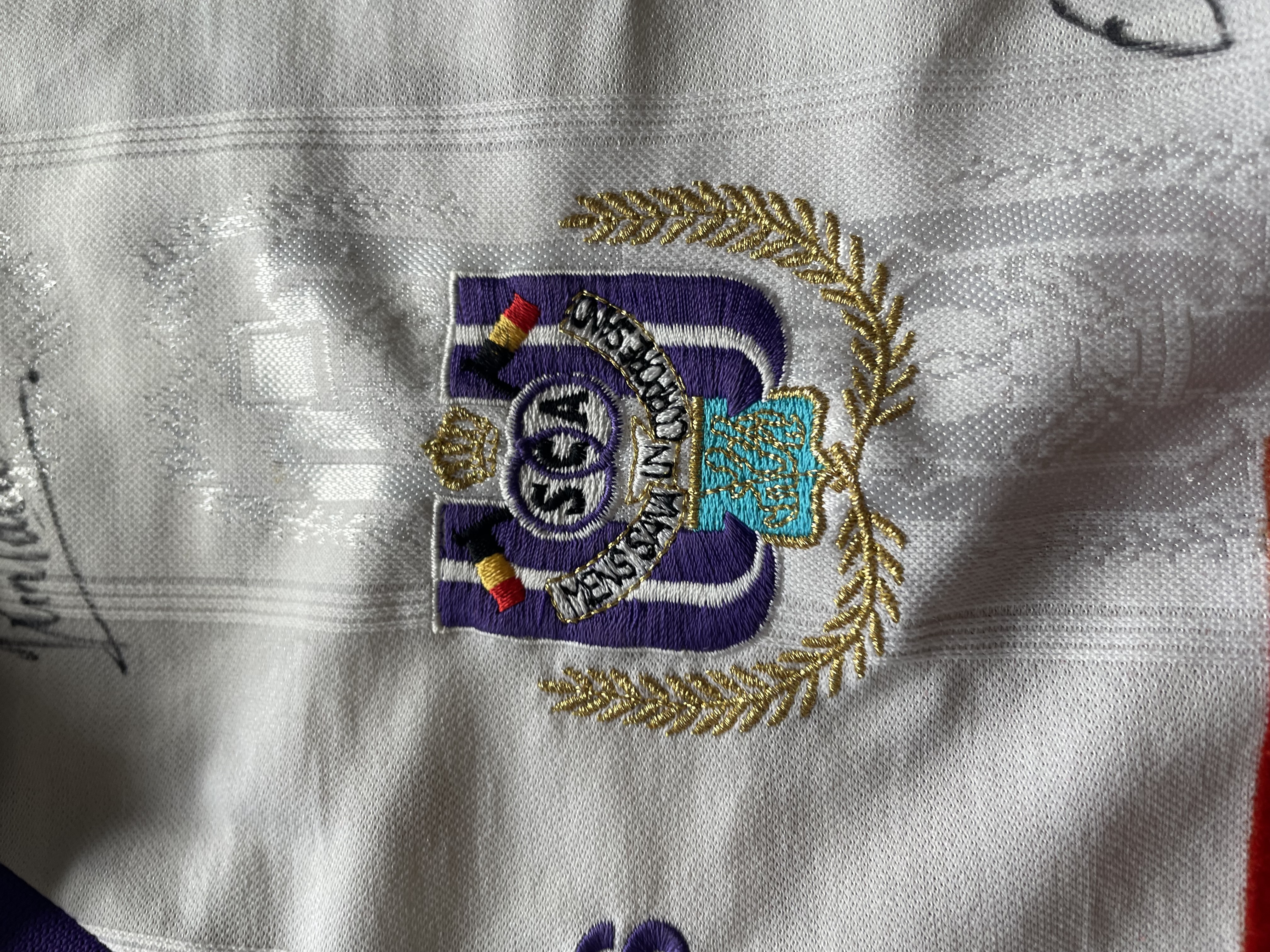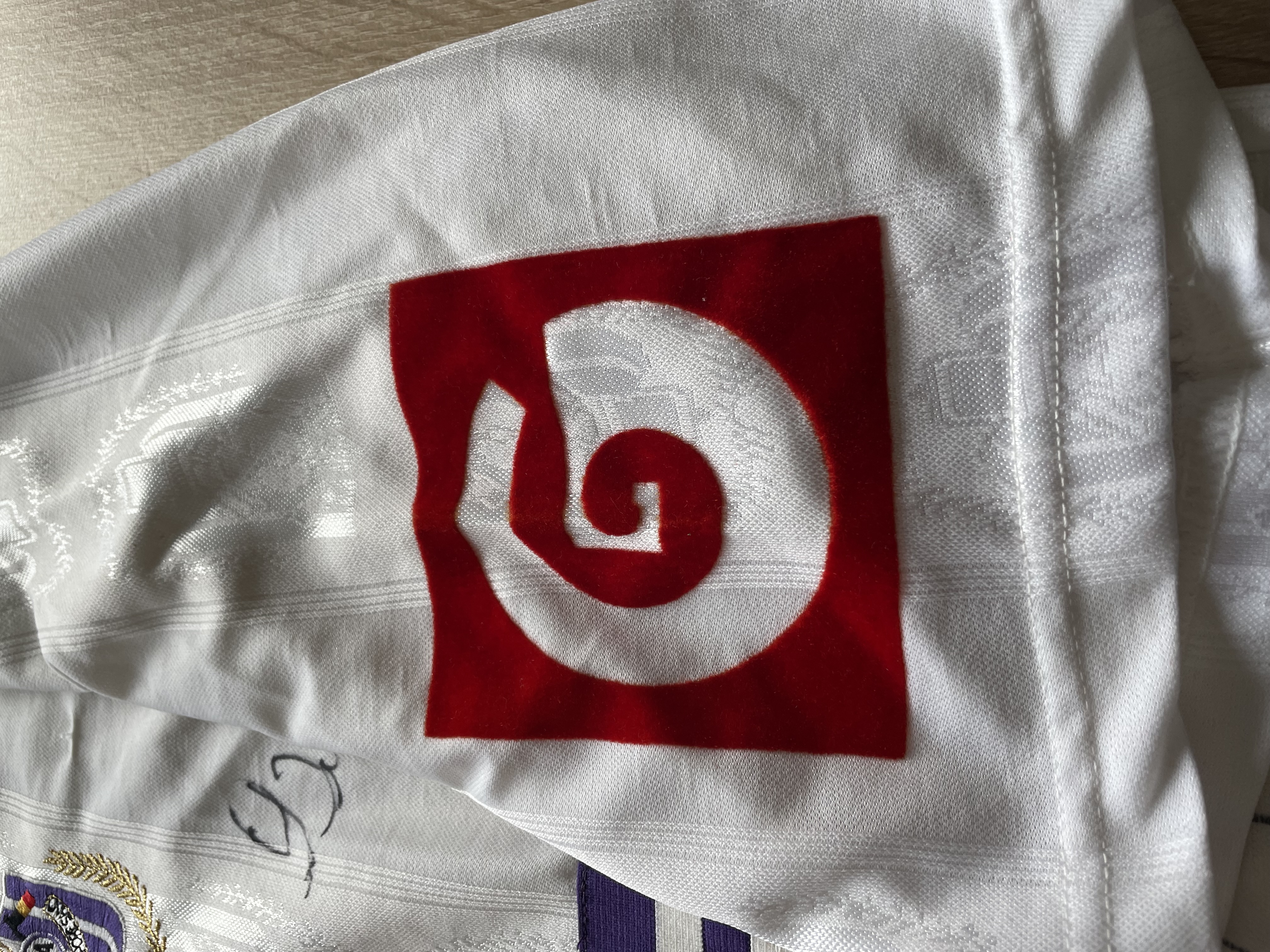 Match version features: The shirt features a "G" on the chest made of a different material compared to the fanshop shirts from that time, as well as a "G" sponsor on the sleeves. These features were not commercially available at the time, indicating that this is a match shirt.